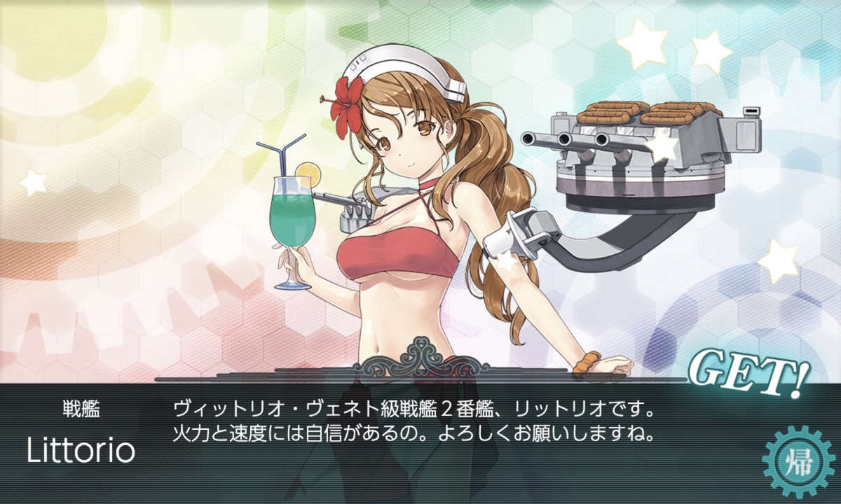 2017年の春イベで初めてLittorioが着任して狂喜乱舞し、更に続けて夏イベでも2隻目をドロップしたんだけど、その頃は母港100隻提督だったこともあって泣く泣く餌に。